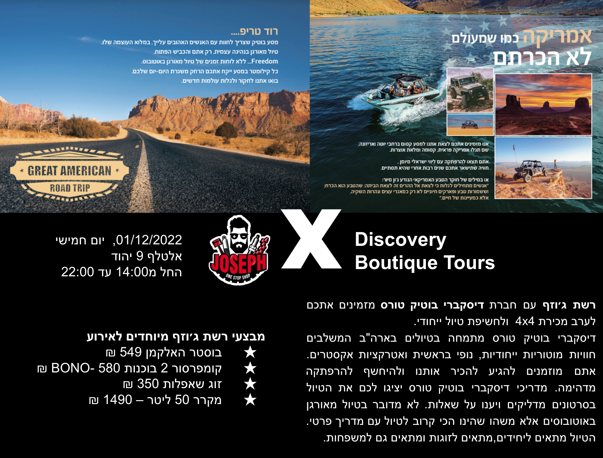 ג'וזף ביחד עם חברת דיסקברי בוטיק טורס מזמינים אתכם לערב מכירות 4X4 ולחשיפת טיול ייחודי .