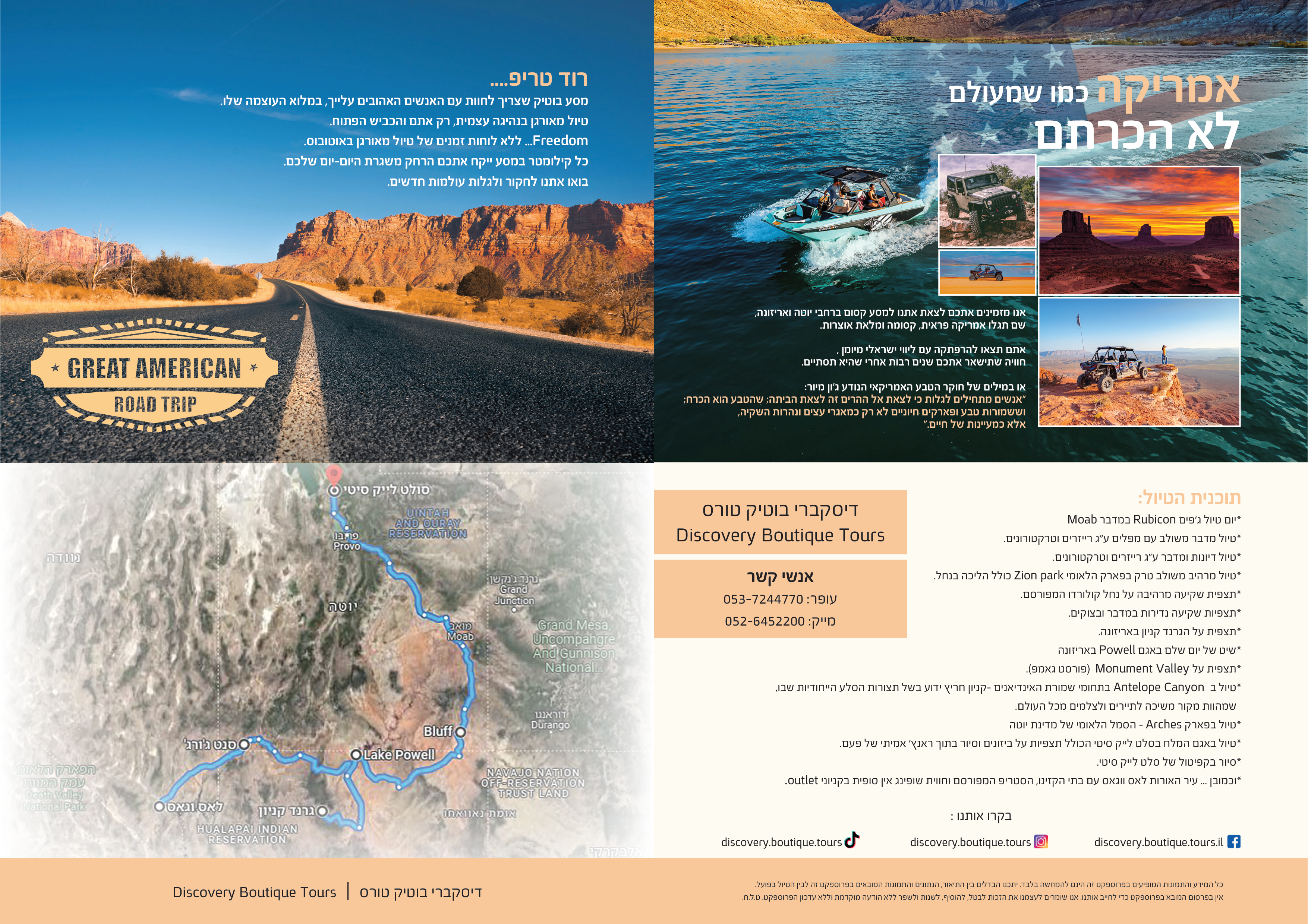 דיסקברי בוטיק טורס מתמחה בטיולים בארה"ב המשלבים חוויות מוטוריות ייחודיות , נופי בראשית ואטרקציות אקסטרים.
