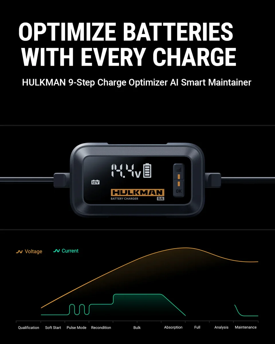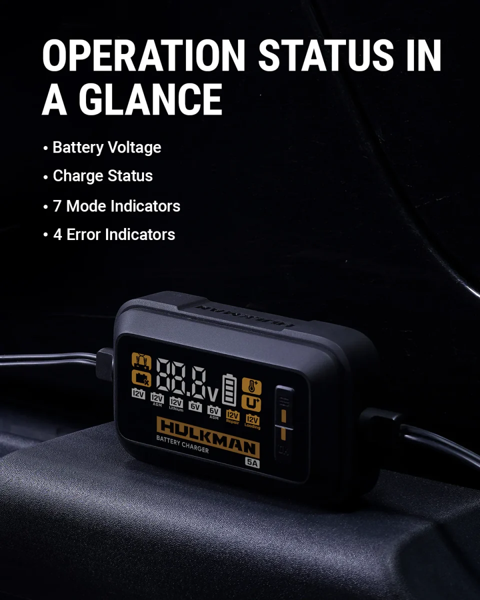 מטען מצברים חכם של חברת HULKMAN האמריקאית, בעל זרם טעינה של 5A. מטען קומפקטי אך חזק ביותר, חסכוני באנרגיה ובעל יכולות ביצוע מרשימות. טעינה חכמה ב-9 שלבים לשמירה על המצבר. אוטומטי לגמרי- פשוט לחבר אל מצבר, מטען מצברים מקצועי של חברת HULKMAN ארה”ב סדרת: NEW UltraSafe Smart Charg 2020
