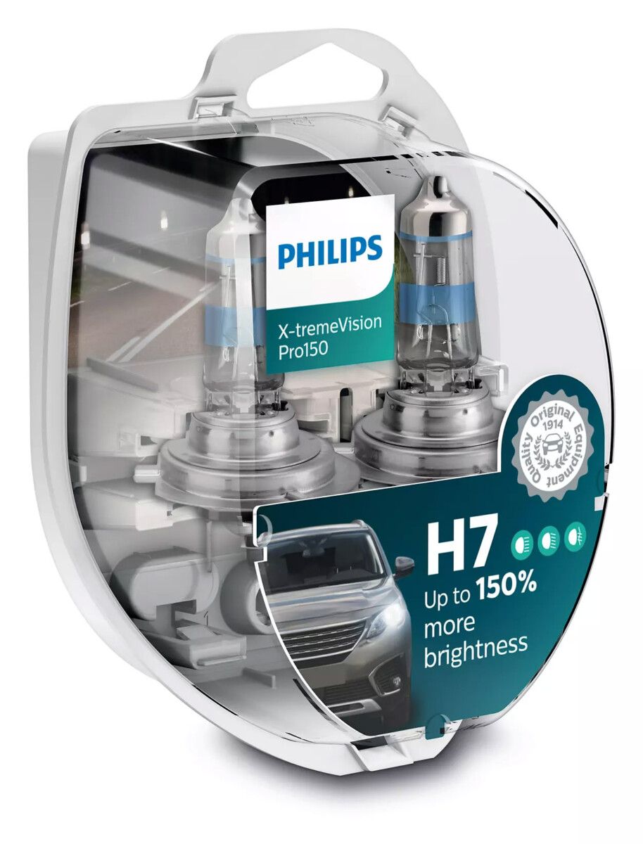 נורת הלוגן H7 מסדרת XtremeVision של PHILIPS המייצרת אלומת אור חזקה יותר בעד 150% מנורת הלוגן סטנדרטית מקבילה.